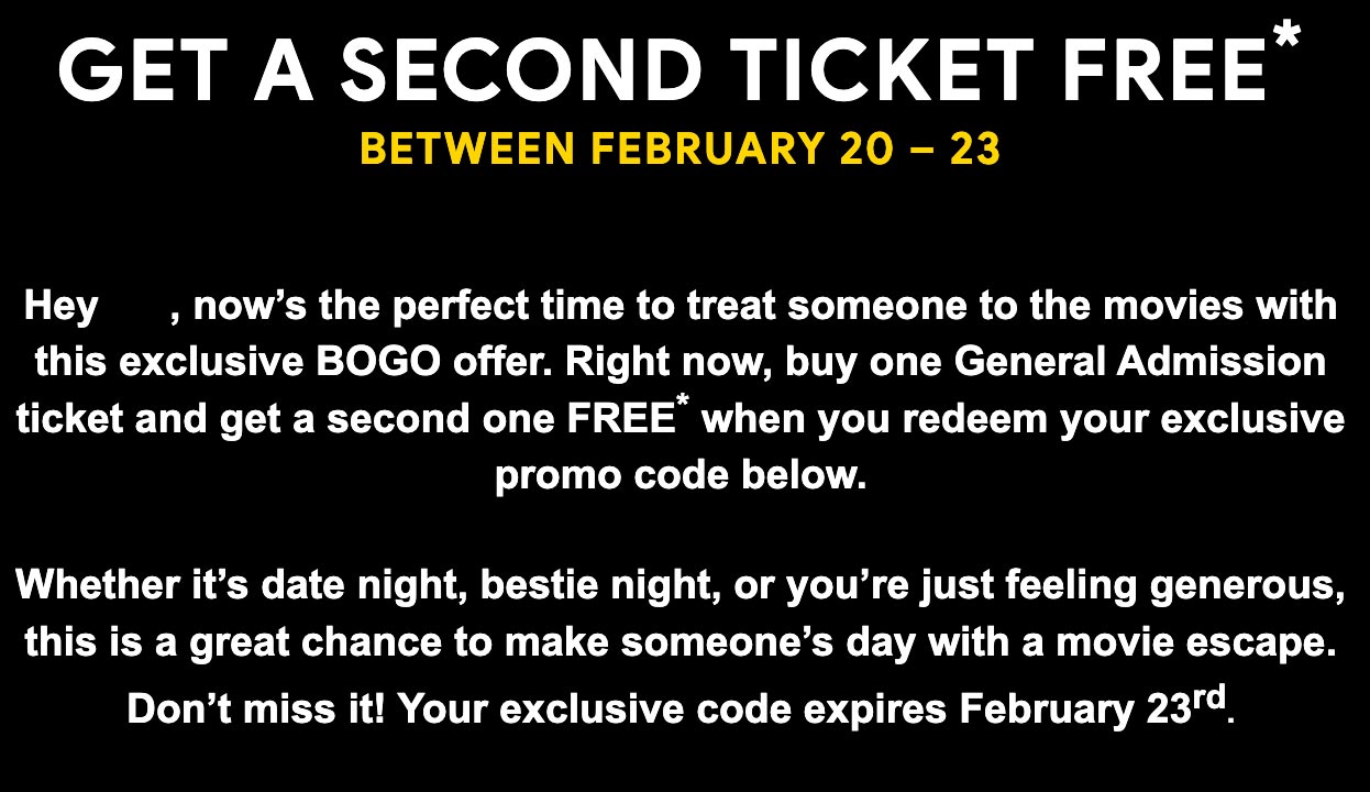 தேர்ந்தெடுக்கப்பட்ட காட்சி உறுப்பினர்கள், குறிப்பிட்ட காலத்திற்கு இரண்டாவது இலவச டிக்கெட்டை வழங்கும் மின்னஞ்சல்களை Cineplex இலிருந்து பெறுகின்றனர்.